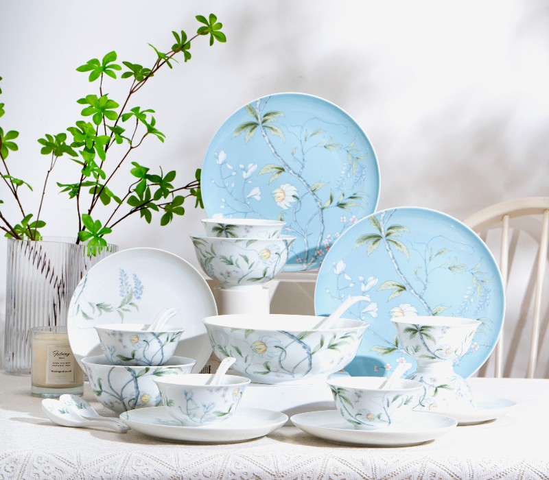 The palette is dominated by light green. The subtle, timeless use of light colors blends the beauty of nature into an elegant dining table, creating a relaxed and comfortable atmosphere.