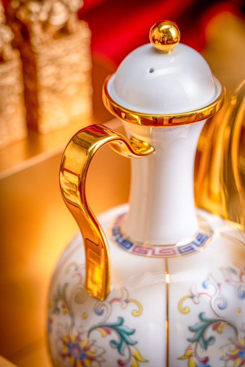 經典寶相花紋結合傳統粉彩工藝,線條勻細,韻律優雅 搭配鎏金裝飾,呈現華貴質感 象徵源遠流長,團結凝聚,生生不息